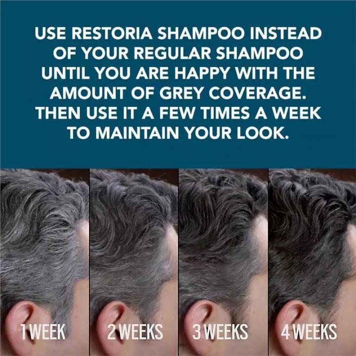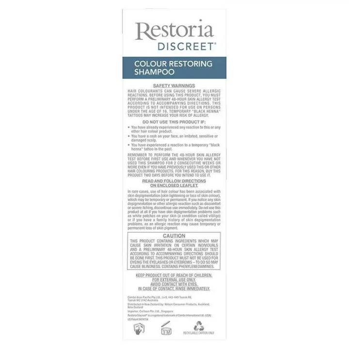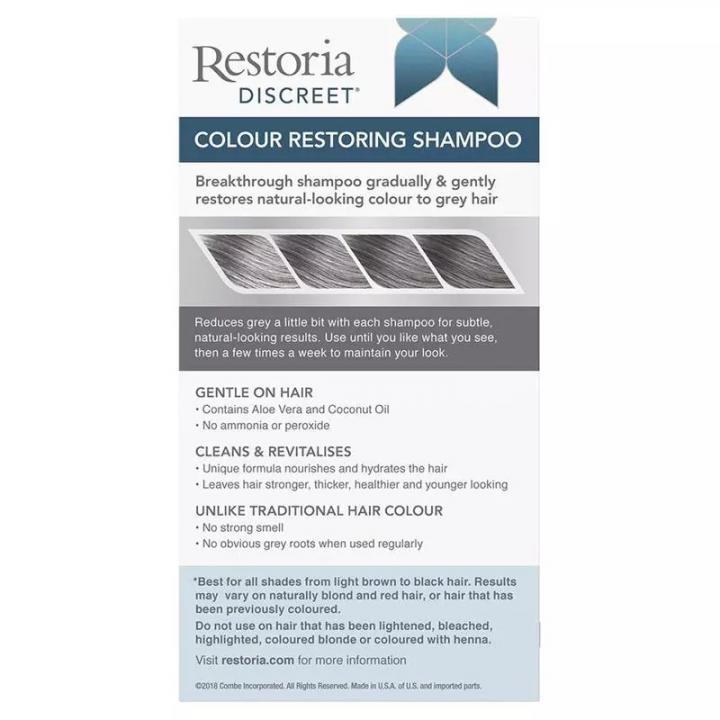 Restoria Discreet แชมพูเปลี่ยนผมขาวให้ดูเป็นธรรมชาติ แชมพูสูตรพิเศษ ค่อยๆ คืนสีผมธรรมชาติ ลดผมขาวอย่างเป็นธรรมชาติเมื่อใช้เป็นประจำ อ่อนโยนต่อเส้นผม ไม่มีแอมโมเนียหรือเปอร์ออกไซด์ ผสานคุณค่าจากว่านหางจระเข้และน้ำมันมะพร้าว ช่วยบำรุงให้ผมแข็งแรง หนา สุขภาพดี
