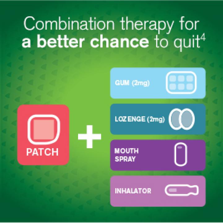 การบำบัดแบบผสมของ Nicorette: หากคุณกลับไปสูบอีกหลังใช้ NRT แบบเดี่ยว หรือยังมีความอยากระหว่างใช้แผ่นแปะนิโคตินสามารถใช้ Nicorette ลูกอมนิโคติน 2 มก. ร่วมกับ แผ่นแปะ Nicorette 16 ชั่วโมง Invisipatch เพื่อช่วยบรรเทาความอยากได้ดียิ่งขึ้น และเพิ่มโอกาสเลิกบุหรี่สำเร็จ