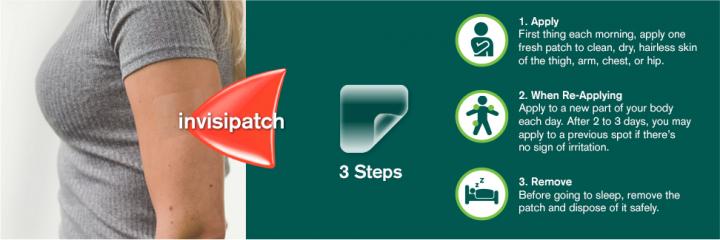 แนะนำให้แปะแผ่นวันละ 1 แผ่นในตอนเช้า บริเวณต้นขา สะโพก แขน หรือหน้าอก และถอดออกก่อนเข้านอน
